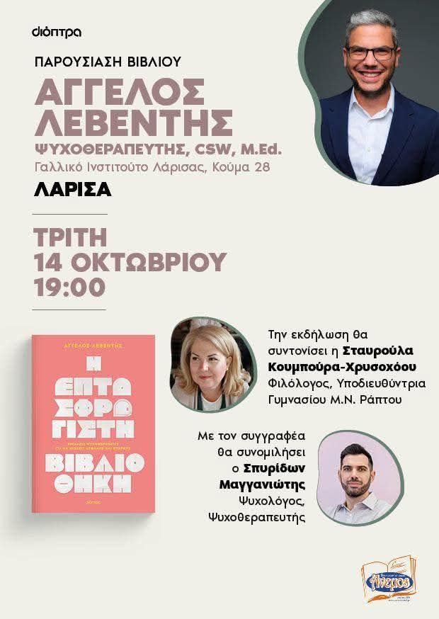 Στις 15 Οκτωβρίου ο Κλινικός Ψυχολόγος και Ψυχοθεραπευτής του Κέντρου μας Σπύρος Μαγγανιώτης συμμετείχε στην παρουσίαση βιβλίου του Ψυχοθεραπευτή Άγγελου Λεβέντη με τίτλο ” Η Επτασφράγιστη Βίβλος” στο Γαλλικό Ινστιτούτο στην Λάρισα . Ευχαριστούμε για την πρόσκληση.